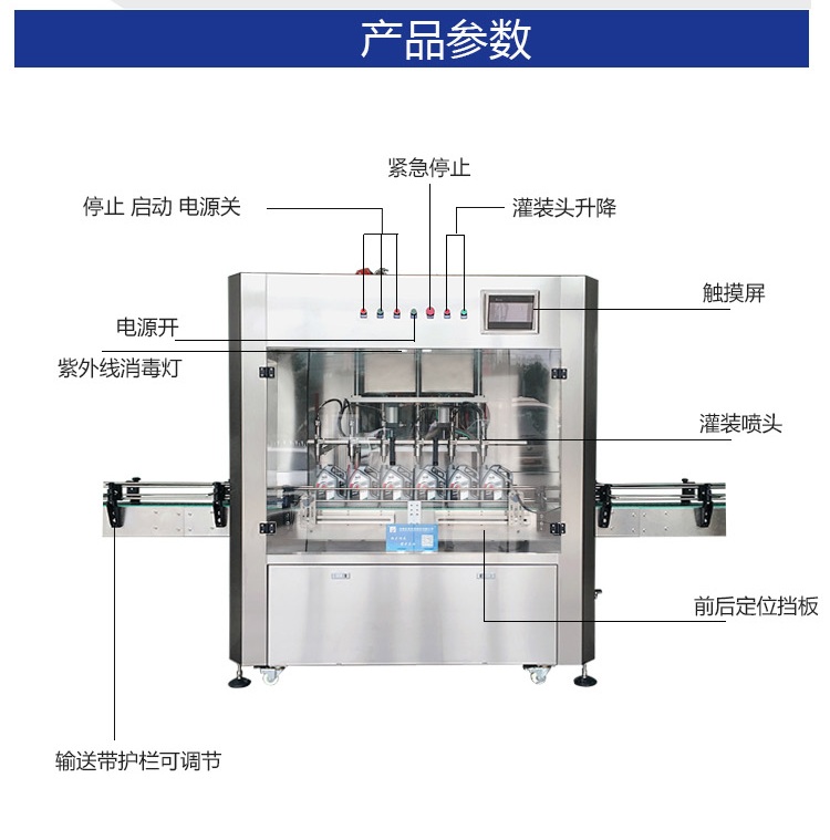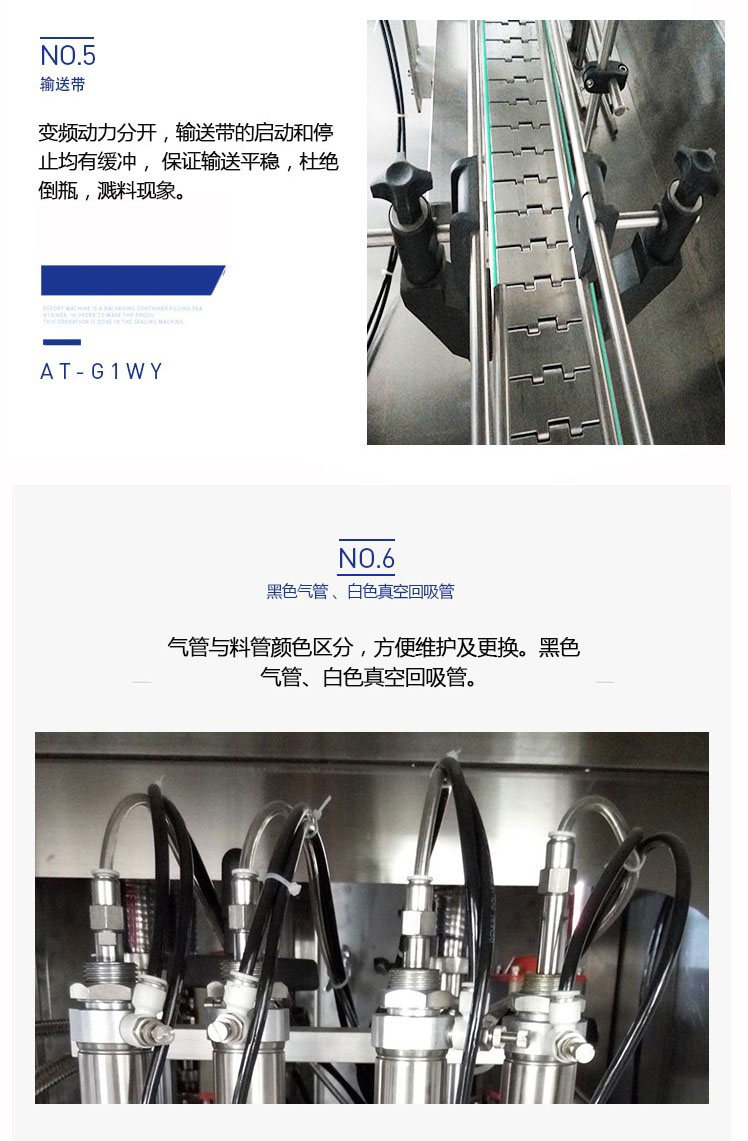 該(gāi)六頭柱塞式全自動(dòng)潤滑油灌裝機(jī)特(tè)的灌裝頭設計及真(zhēn)空回吸(xī)係統,確(què)保灌裝過程無殘油滴(dī)漏,快慢雙速灌裝,灌裝速度可調,杜絕溢瓶現象。該機(jī)采用動力灌裝,無需(xū)配裝高位罐,簡化了安裝工序,提(tí)高了(le)灌裝效率。履帶式壓蓋機,穩定無噪音,無空壓現象。觸摸屏界麵(miàn)友(yǒu)好,操作簡捷,SIEMENS PLC控(kòng)製係統,運算速度快,性能穩定,品質卓(zhuó)越。電、氣件均采用精品元件(jiàn),確保整機運作穩定(dìng)。