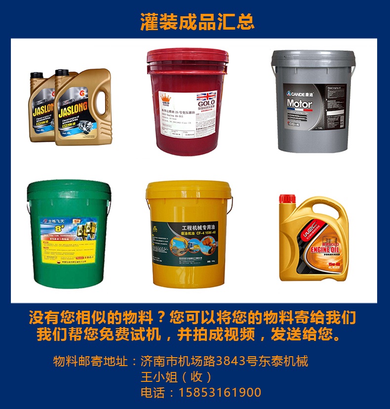 本(běn)機是根據潤滑油的特性(xìng)而設計的一款全自動稱(chēng)重式(shì)潤滑油灌裝機,該機設計緊湊合理,外形簡潔(jié)美觀大氣,灌裝量調節方便(biàn),精度(dù)高,借鑒灌裝流程控製技術,進口彩色觸摸屏人機界(jiè)麵,灌裝進程實現一鍵式操作,性能穩定。采用兩個316儲油箱解決灌裝量大的問題,一個進油口控製兩(liǎng)個油箱的液位(wèi),一個儲油(yóu)罐分別控(kòng)製5個灌(guàn)裝(zhuāng)頭,速度更快,精度更高(gāo)。