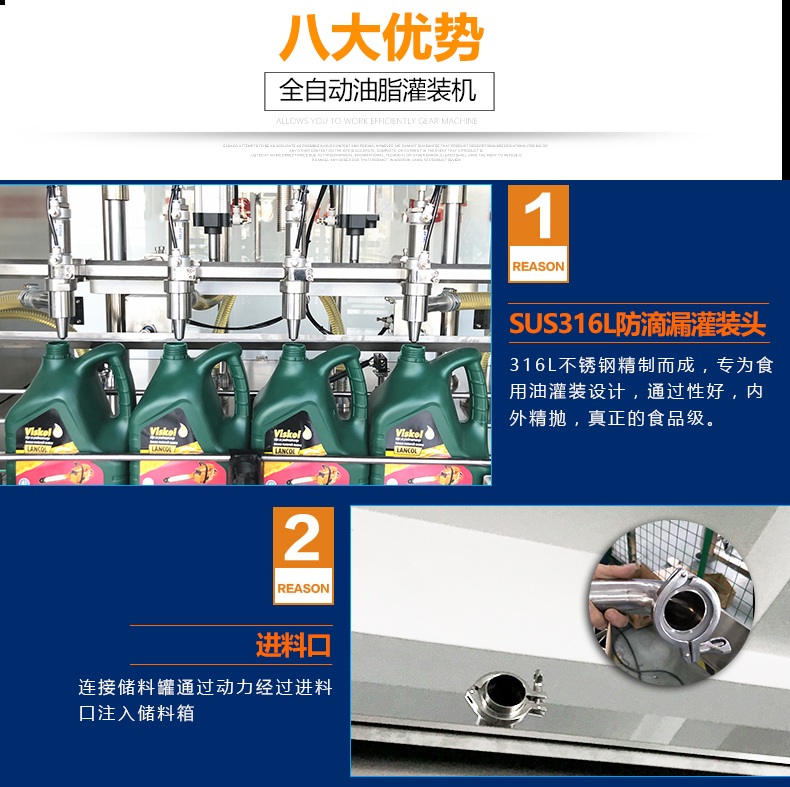 1.防滴漏灌裝頭由(yóu)SUS316L不鏽鋼精製而成,專為食用油灌裝設計,通過性好,內外精拋,真正的(de)食(shí)品級.