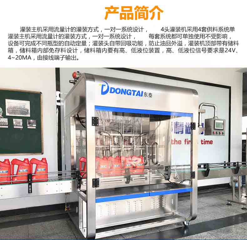 5.灌裝(zhuāng)頭為國家專利產品,專利獲得者為(wéi)東泰公司,獨有的雙重防滴漏(lòu),灌裝下料口設計精細,行程短,同時也提高了整條(tiáo)線的灌裝速度和灌裝精度,保證(zhèng)在正常灌裝過程中一滴油都不會(huì)滲漏