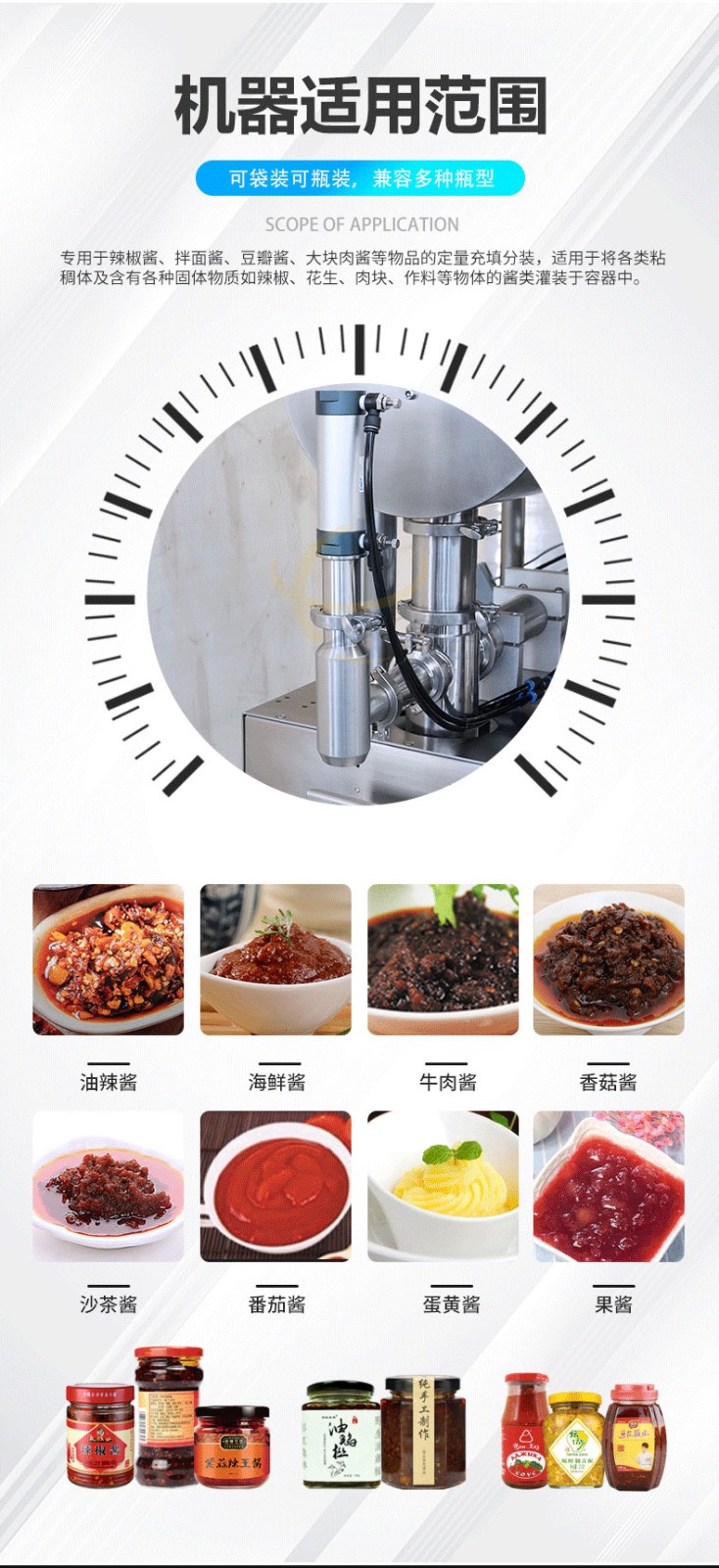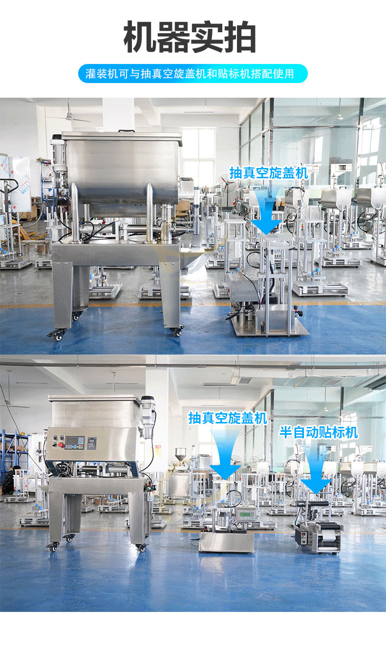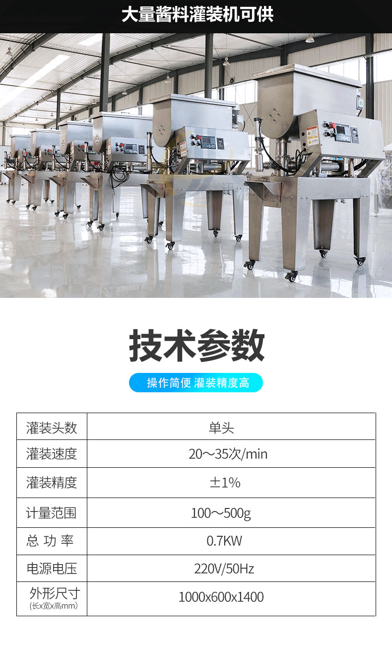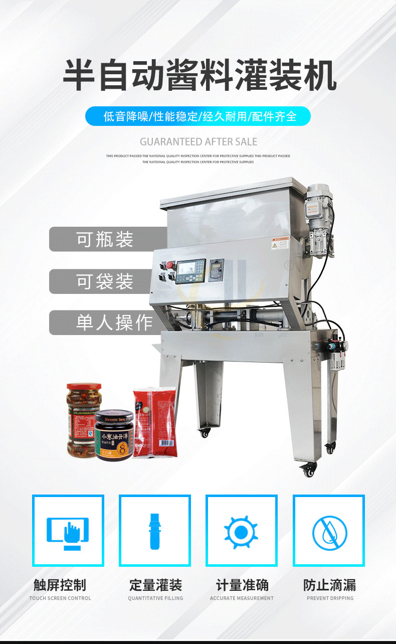 半(bàn)自動醬料灌裝機(jī)適用於辣椒醬、豆瓣(bàn)醬、拌(bàn)麵(miàn)醬、大塊肉醬(jiàng)等物品的定量充填分裝,適用於將各類粘稠體及含有各種固體物質
