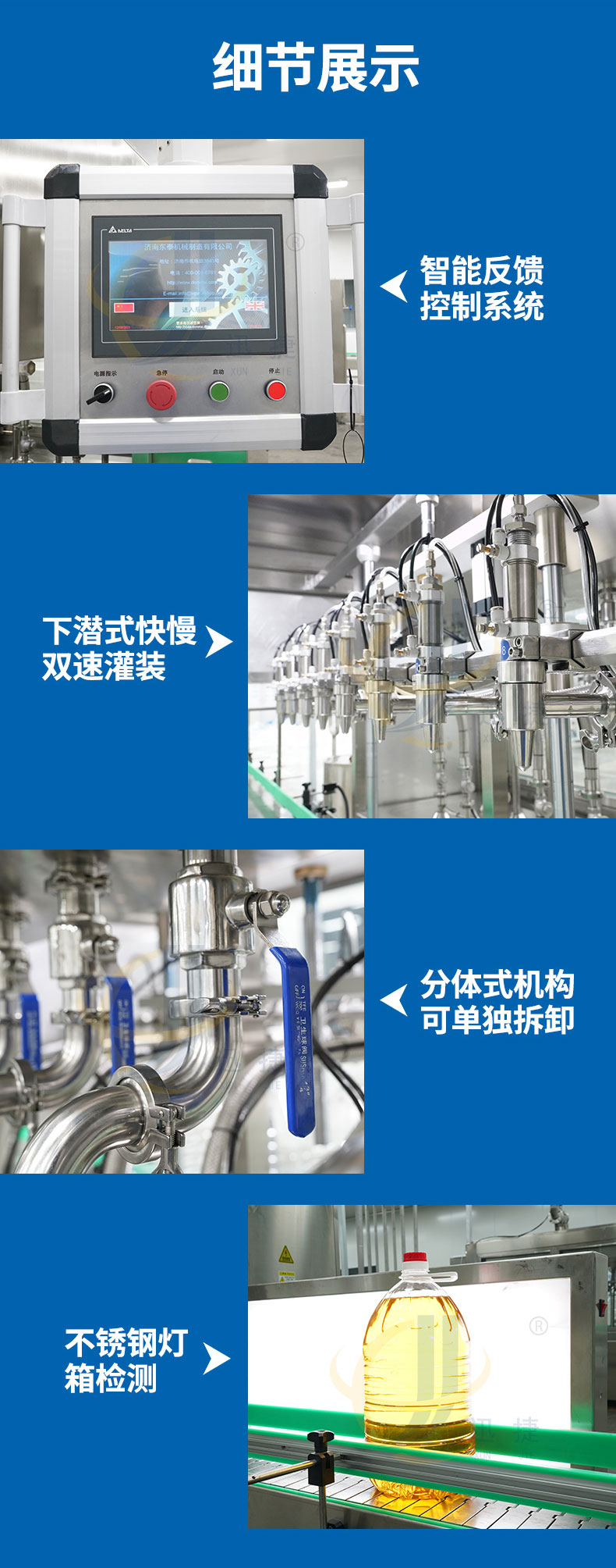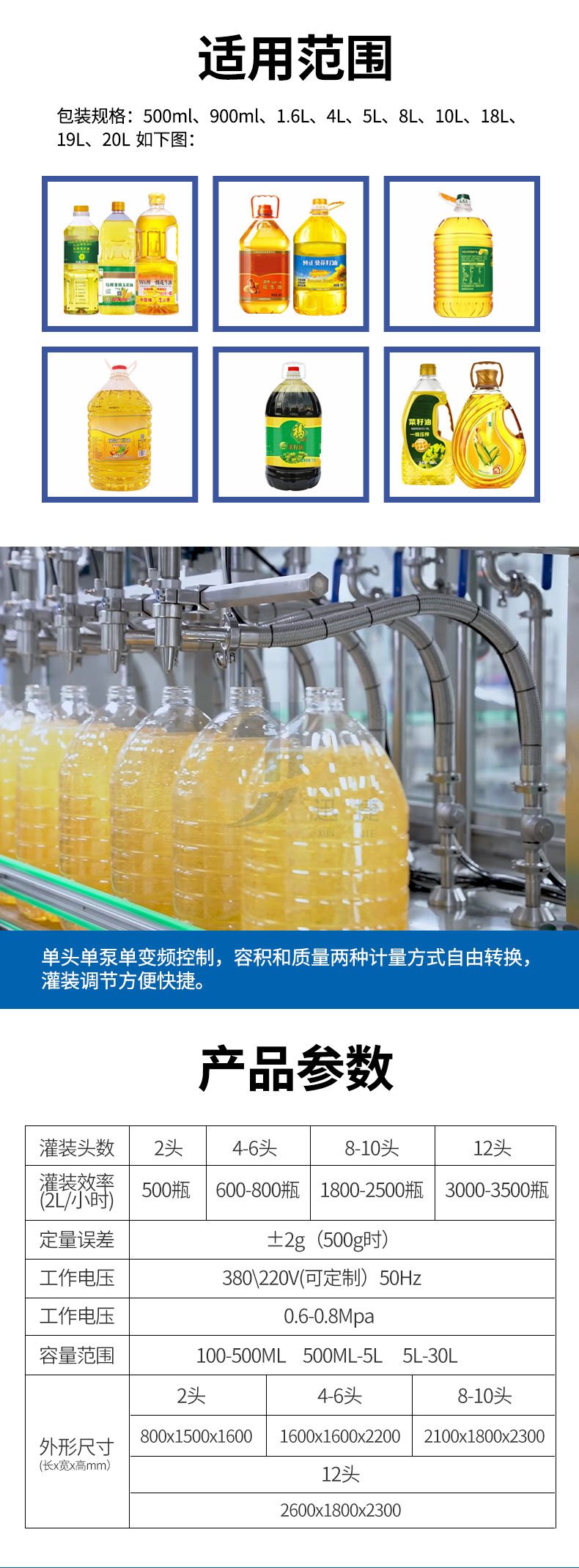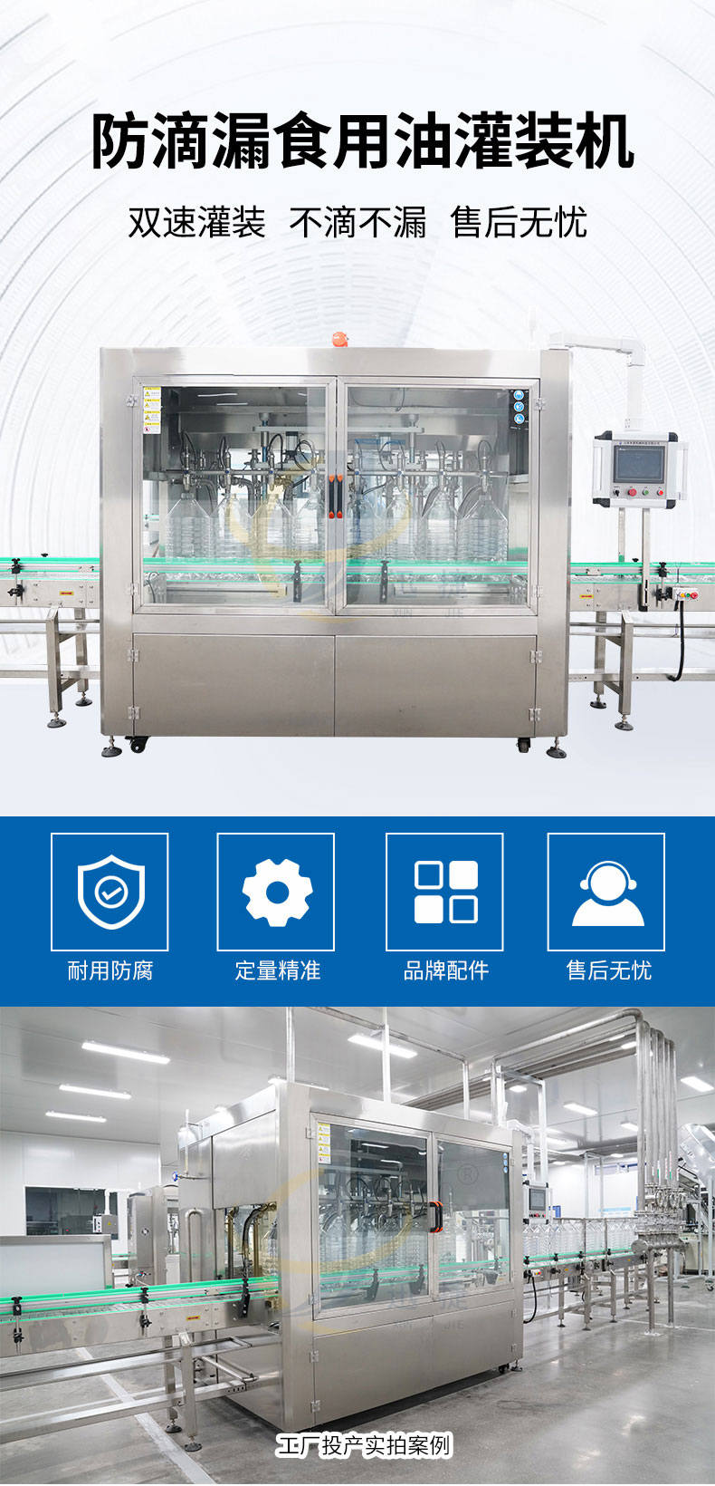 全自動八頭食用油(yóu)灌裝機單頭單泵單變(biàn)頻控製,容積和(hé)質量(liàng)兩種計量方(fāng)式自由轉換,灌裝調節方便快捷。