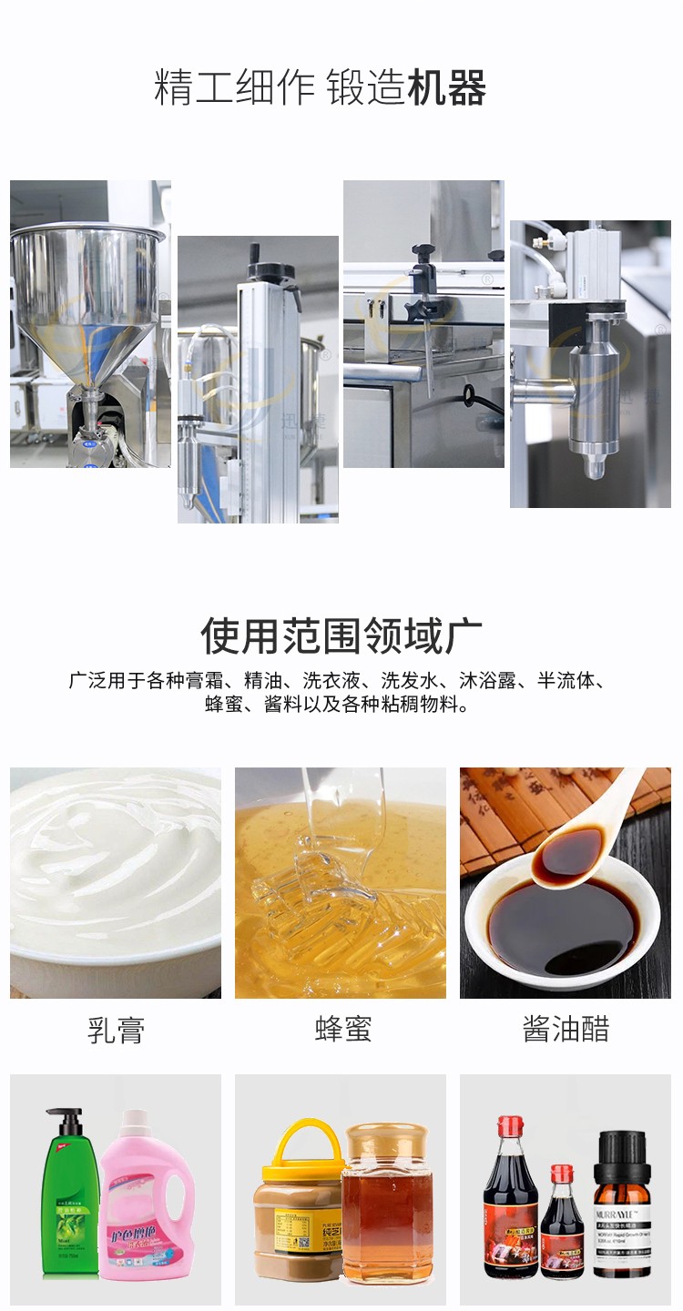單頭膏(gāo)體(tǐ)灌裝機適用範圍:廣泛用於(yú)化(huà)妝(zhuāng)品、食品、醫藥、化工原料等行業。各種膏(gāo)霜、精油、洗(xǐ)衣液、洗發水、沐(mù)浴露、半流體