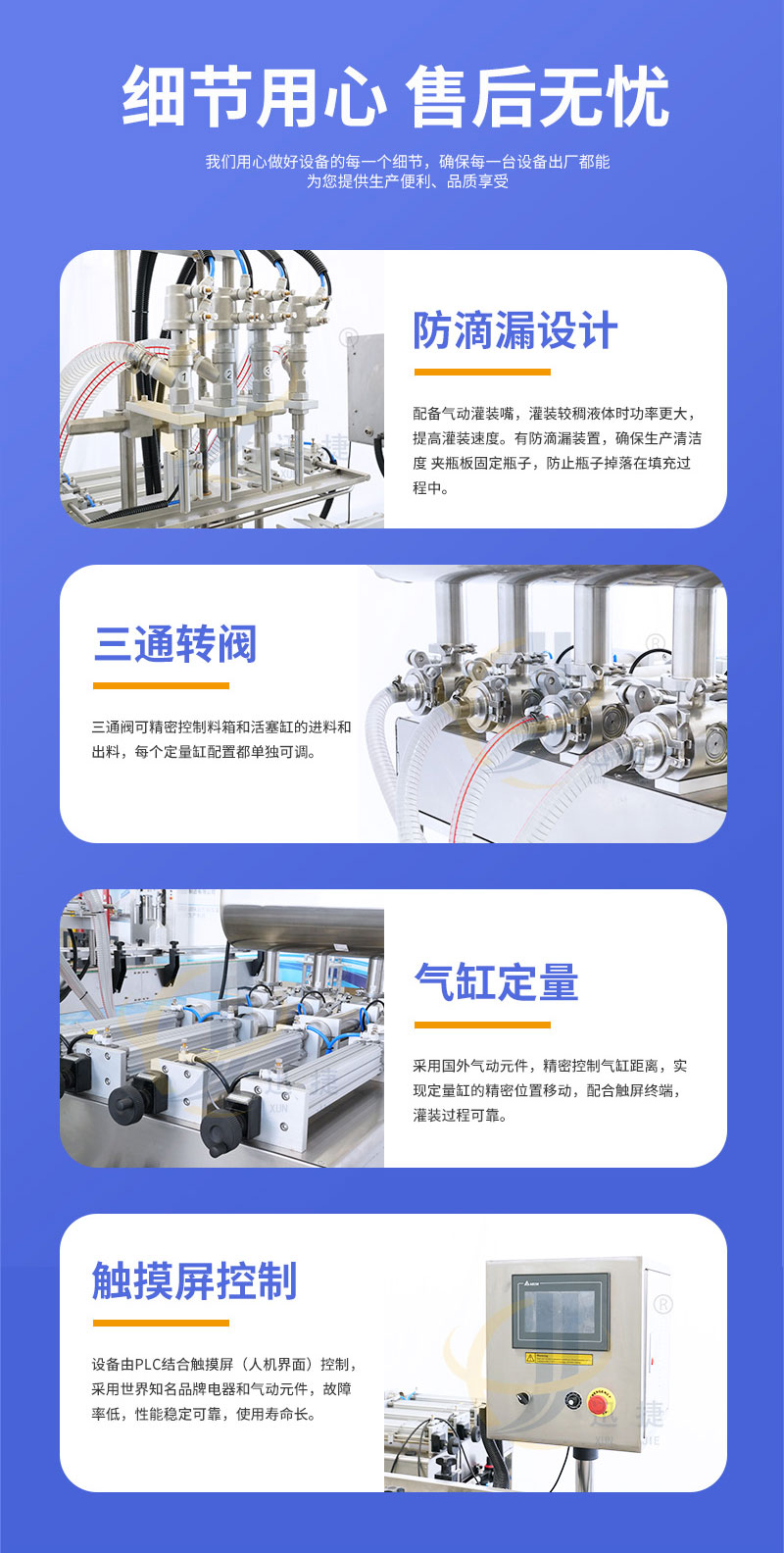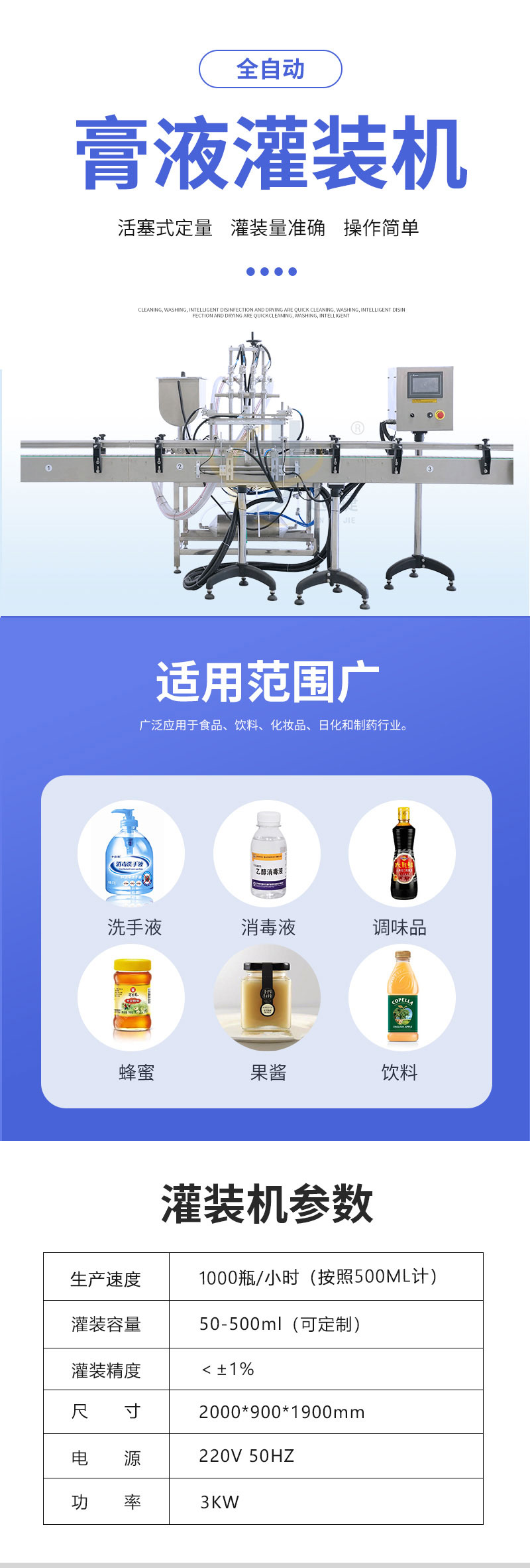 全自動膏液灌裝(zhuāng)機適用於食(shí)品、飲料、化妝品、日化和製藥行業。灌裝頭設有(yǒu)特殊防漏裝置,灌裝(zhuāng)無拉絲,滴漏現象。