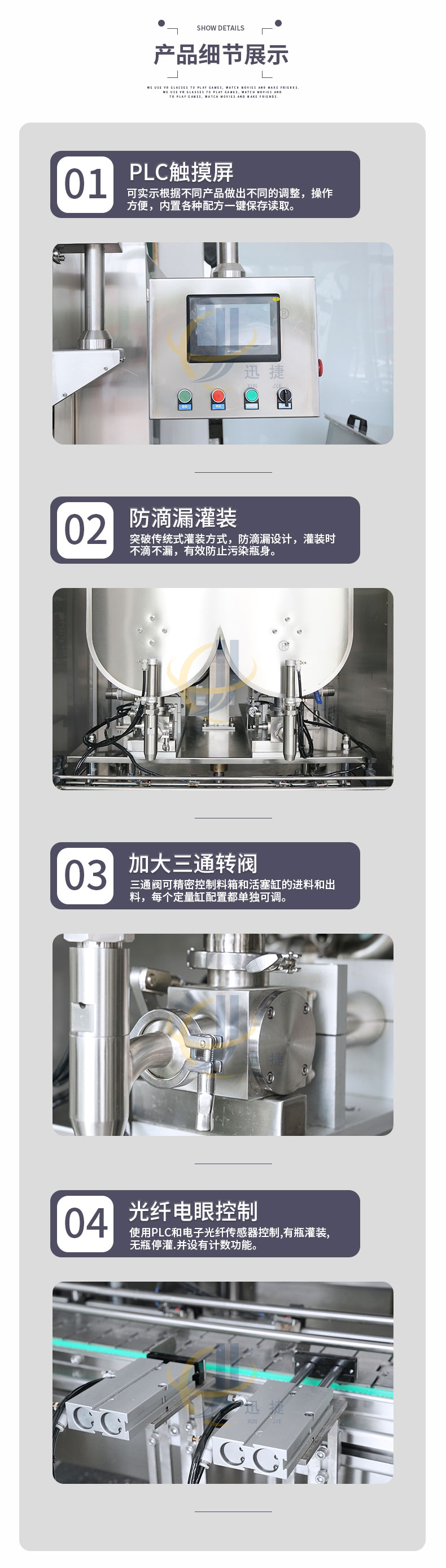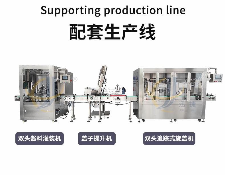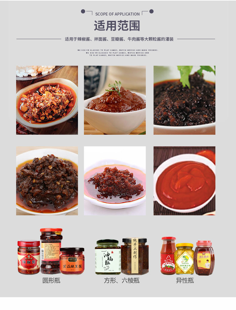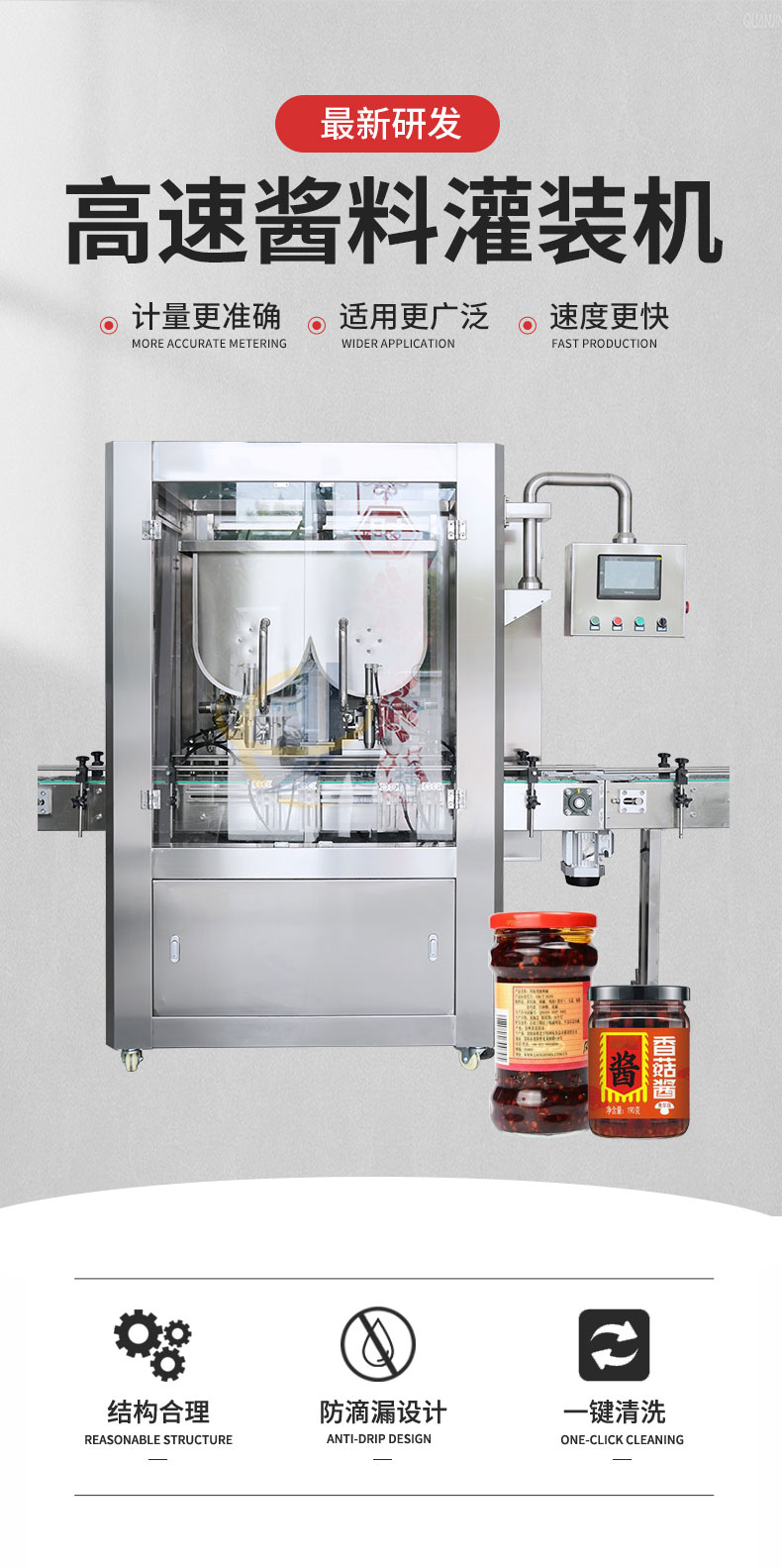 雙頭(tóu)高速(sù)醬料灌裝機適用於調味品中帶顆粒並且濃度較大的辣椒醬、豆瓣醬、花生醬、香菇醬、果醬、牛油(yóu)火鍋底(dǐ)料。