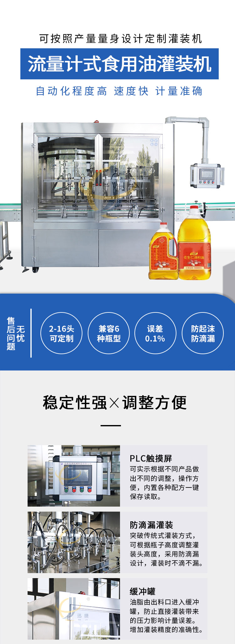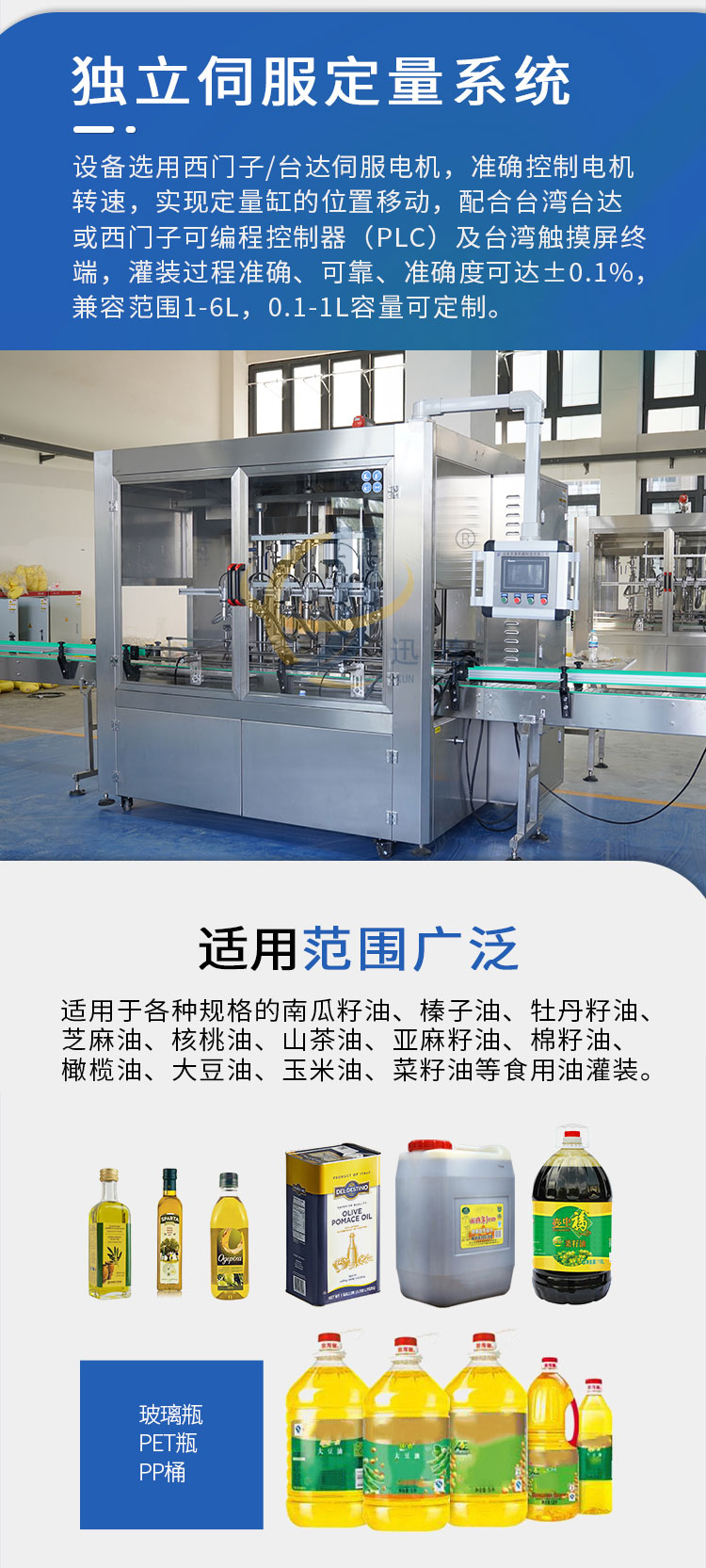流量計食用油(yóu)灌裝機適用於亞麻籽油(yóu)、菜籽油、大豆油、芝麻油、橄欖油、花生油、玉米油、山茶(chá)油等食用油灌裝。