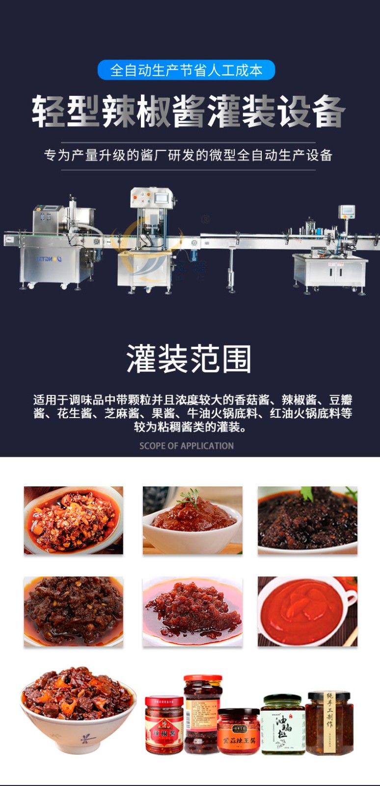輕型辣椒醬灌裝生產線適用於調味品中(zhōng)帶顆粒並且濃度較大的(de)香菇醬、辣椒醬、豆瓣(bàn)醬、花生醬、芝麻醬、果醬、牛油火鍋底料、紅油火鍋底料等較為粘稠醬類的(de)灌裝。