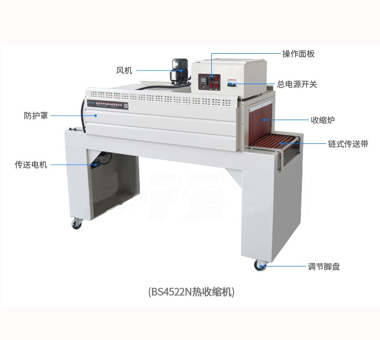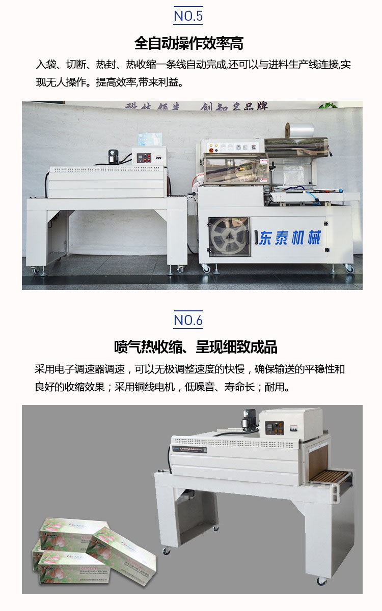 自動塑料膜熱收縮包裝機結構緊湊占地(dì)麵積小,非常適合(hé)配套自動包裝流水線完成產品的自動無人化包裝(zhuāng),適合於單個物品(pǐn)包裝或有底托物品包裝。