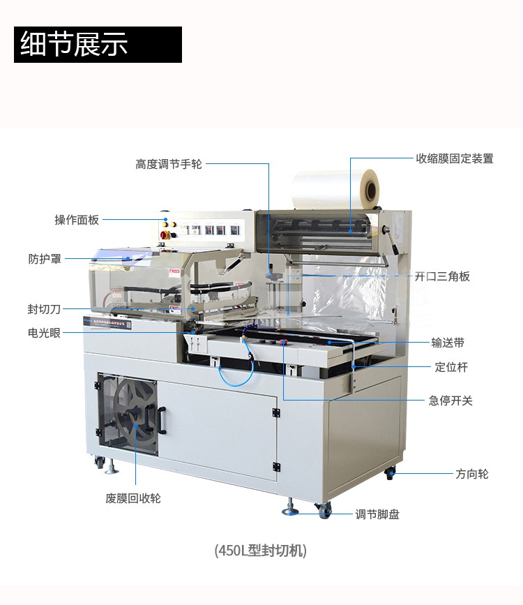 配合L型封切(qiē)刀使收縮膜包裝一次封切(qiē)成型,鍍特(tè)氟龍不粘層(céng)封口布,封切不黏膜,且封口整齊不開裂,產品經封切(qiē)後(hòu),進入自動塑料膜熱收縮包裝機完成包裝(zhuāng)。