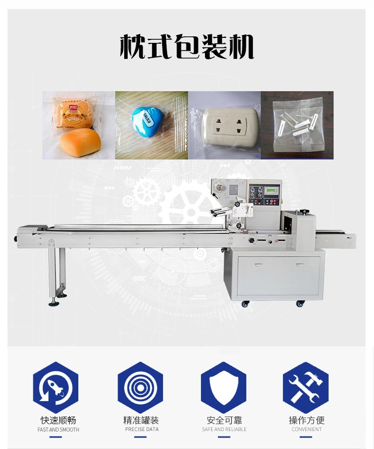 該枕式包裝機可(kě)用於餅幹、月(yuè)餅、蛋黃派、米餅、雪糕、方(fāng)便麵、巧克力等塊狀產品的(de)包裝,特別適合於(yú)小批量單一產品的包裝(zhuāng)。