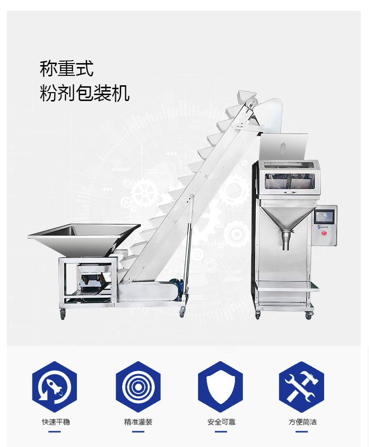 該稱(chēng)重包裝機適用於農藥、飼料、添加劑、洗衣粉、食鹽、味精、白糖、種子、大米等顆粒粉狀物料的定(dìng)量稱重包裝。