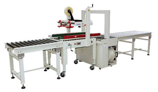 封箱機(紙箱膠帶封口)+高解析噴碼機(日期、批號、廠名等信息噴印打碼設備)+自動(dòng)打包機(自動(dòng)打出兩道(dào)PP帶。進行(háng)紙箱捆紮包裝)
