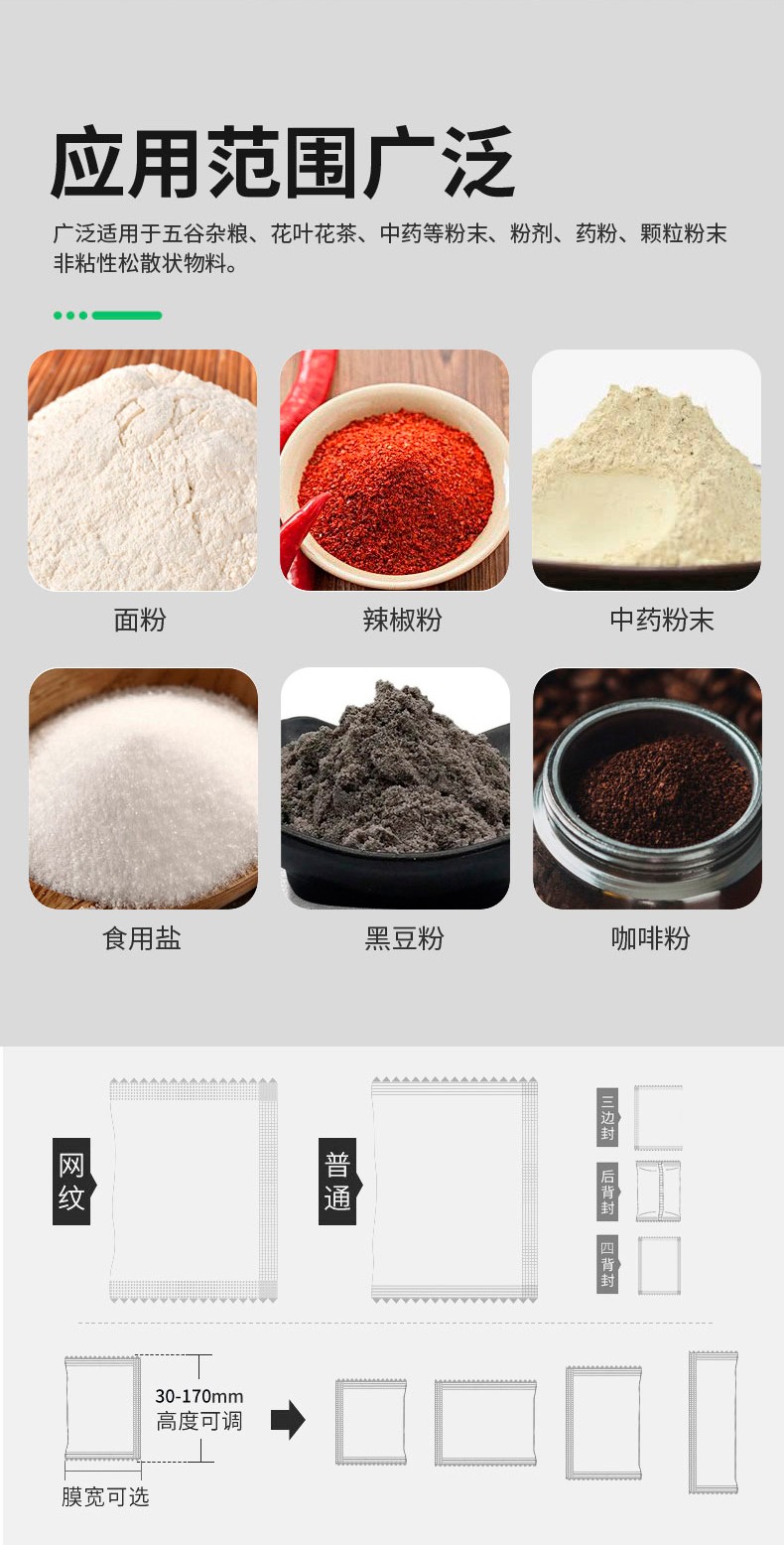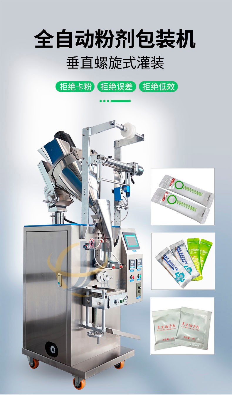 粉(fěn)劑包裝機比較適用於豆奶粉、辣椒粉、奶(nǎi)粉(fěn)、咖啡麵粉、麵粉等(děng)物品的計量包裝。與此同時還(hái)可以(yǐ)包裝澱粉、奶粉、食用鹽、中藥粉末、調(diào)味品、黑豆粉、預(yù)混料、飼料、酶製劑等。粉劑包裝機包裝材料(liào):BOPP薄膜、紙/聚乙烯、玻璃紙/聚乙烯、聚酯/鍍鋁(lǚ)/聚乙烯、聚酯/聚乙烯、茶葉濾紙等可熱封複合包裝材料。