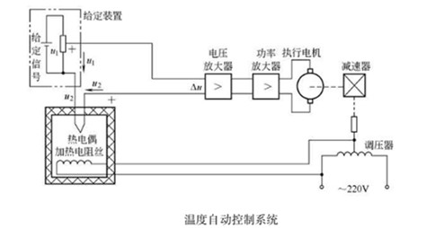 如果將控溫過程中的(de)人工操作 (檢測和調節) 換由自動(dòng)控製裝置完成(chéng),則成為包裝機自動控溫係統。如下圖所示,檢測元件熱電偶檢測(cè)恒溫箱內的溫度,並將溫度轉換為對應的電壓信號2 ,同時反饋給比較器。比較器(qì)比較表示給(gěi)定溫(wēn)度的給定電壓信號1與檢測電(diàn)壓信號2的大小,得到溫差(chà)信(xìn)號,其大小和正負代表溫差的大小和方向。溫差(chà)信號△經電壓放大和功率放大後(hòu),控(kòng)製執(zhí)行電機的轉(zhuǎn)速和方向,執行電機通(tōng)過傳動裝置拖動調壓器觸頭調節供熱電壓。當溫度偏高時,動觸頭向著減小電壓( 電流)方向轉動; 反(fǎn)之,當溫度(dù)偏低時,動(dòng)觸頭則向著增大電壓( 電(diàn)流)方向運動,直至恒溫(wēn)箱內溫度達到給定溫度,溫差信號△=0 時觸頭停止運動(dòng)。