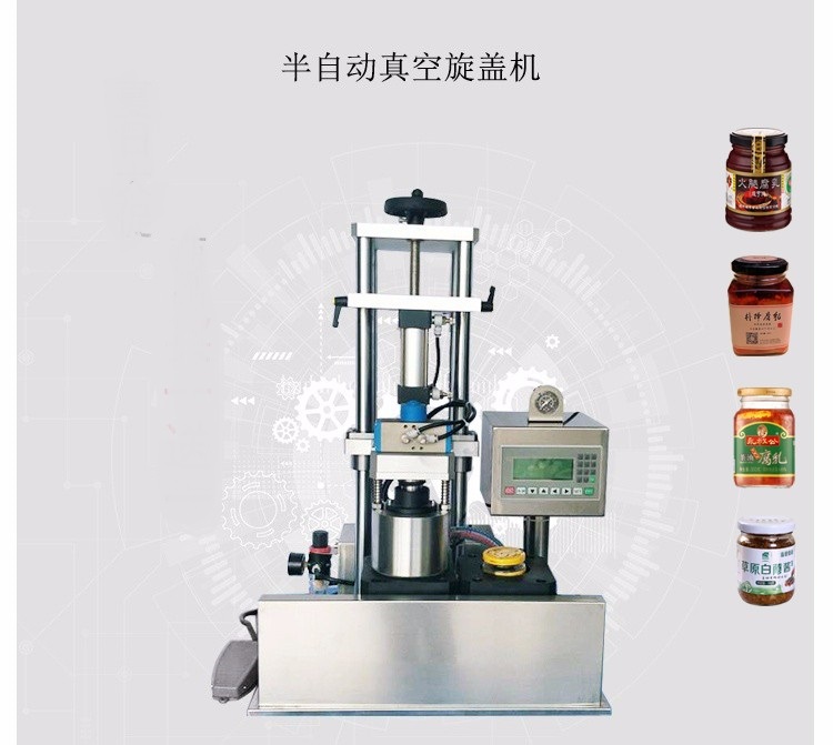 半自動辣椒醬真空旋(xuán)蓋機顧名思義是旋蓋真空一體機,集抽真空旋蓋於一體。