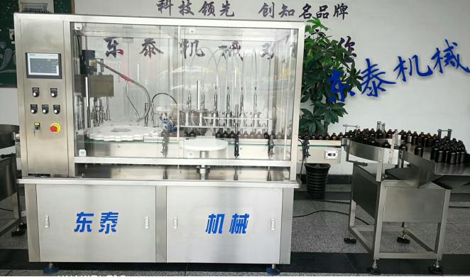 對於注重(chóng)快速精準的小瓶灌(guàn)裝,迅(xùn)捷機械拿出了自己的方案,那(nà)就是新一代的(de)小瓶灌裝機。該小瓶灌裝機屬(shǔ)於全自動旋轉式(shì),適用於小劑量液體灌裝,如精油、眼藥水、口服液、糖(táng)漿、電子煙油、藥液(yè)等。集灌裝旋蓋為一體,灌(guàn)裝穩定精準(zhǔn),旋蓋不傷瓶,是小瓶液體灌裝的理想機器。