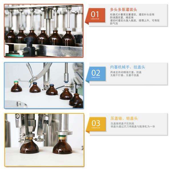 2. 穩定精準快速:柱塞式計量泵定量灌裝,灌裝針頭設有防滴漏(lòu)裝(zhuāng)置,精度(dù)高。每分鍾(zhōng)可灌裝40-60瓶。