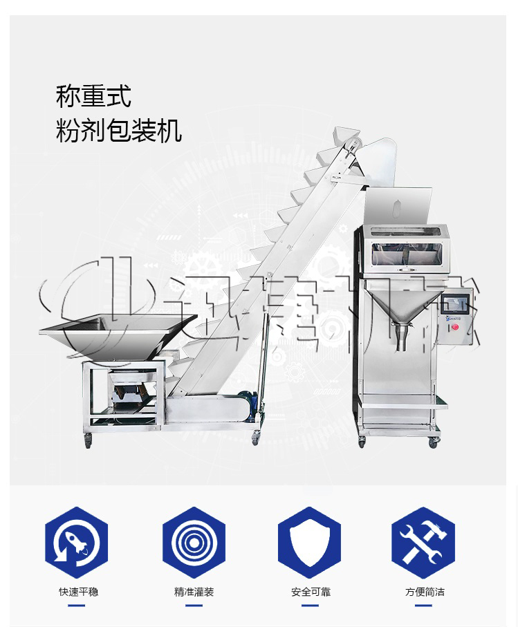粉劑灌裝包含(hán)了上料機、灌裝(zhuāng)機(jī)和封口機。一般粉劑類的產品,上料一般(bān)采用螺旋(xuán)式上(shàng)料,第一,能夠確保原料能夠供應給灌裝機灌裝;第二,能夠減少揚塵,確保灌裝環節(jiē)的空氣質量;第三,采用螺旋是上料,工人在向(xiàng)料鬥加料時輕鬆(sōng)、方便、快捷,大大提高生產效率;第四,上料(liào)機拆裝方便,采用的正反轉(zhuǎn)開(kāi)關,可將(jiāng)上料機清洗幹淨整潔。