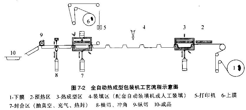 如下(xià)圖(tú)所(suǒ)示是全(quán)自動熱成型(xíng)包裝機的(de)包裝工(gōng)藝流程示意圖。整機(jī)采用連續步進的方式,由下卷膜成型, 上卷膜作封口。