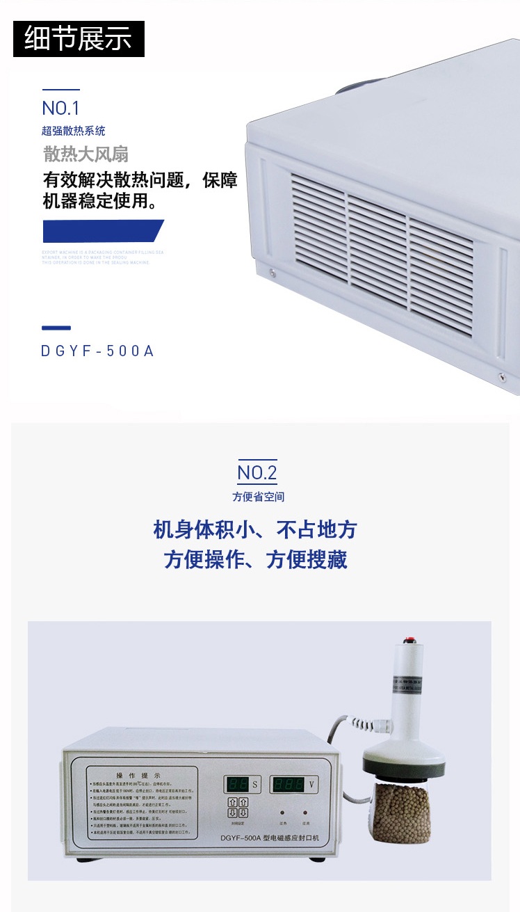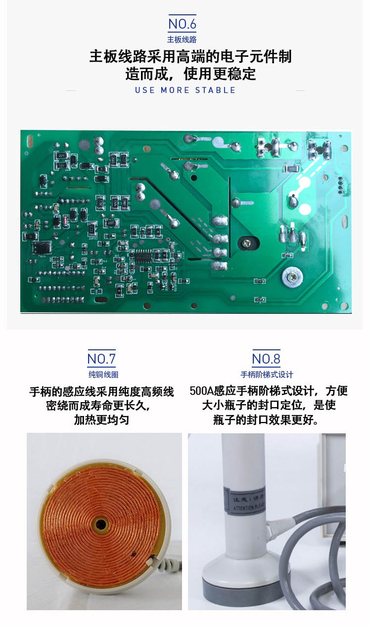 本機采用國外先進線路,選用日本新模塊化功率(lǜ)器件,較於一般電子感應加熱器更省電,熱效率達到90%以上,瞬時加熱(rè)速度為後者的20-30倍,因此不僅 適(shì)用於熱封性能較好的聚乙烯、聚丙烯材質的(de)瓶體,而且對熱封性能較差的(de)聚酯瓶、玻璃瓶也有(yǒu)極好的封口效果。