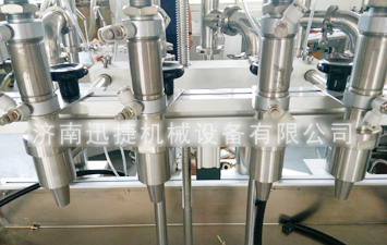 3、各個灌裝頭可在一定範圍內(nèi)任意調節間距和高(gāo)度,可使用各種(zhǒng)大小形狀的容器的灌(guàn)裝。