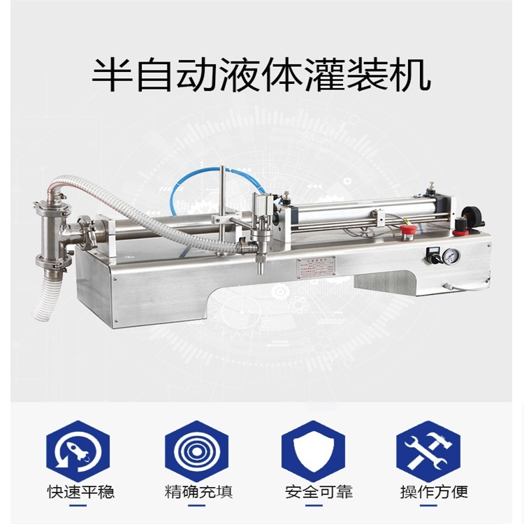 小型半(bàn)自動單頭液體灌裝機主要用於食(shí)品、醫(yī)藥、化工、日化(huà)、洗滌類、農藥(yào)及特殊行業的灌裝。該設備是香蕉大影院機械引進國外先進灌裝(zhuāng)機技術對傳統的小型(xíng)半(bàn)自動單頭液體灌裝機進行了進一步的改造和創新。改造後的設備結構簡單合(hé)理,灌裝精確度(dù)高,操作簡(jiǎn)便,使用(yòng)靈活。現已廣泛應用於全國上萬家客戶的灌裝(zhuāng)生產線(xiàn)中。