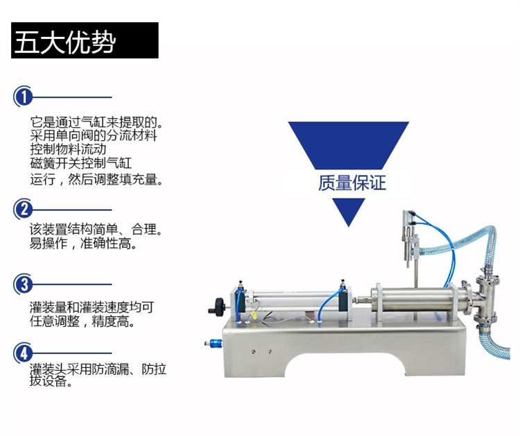 A、該設(shè)備通過氣缸帶動一個活塞來抽取和打出物料,用單向閥(fá)控製物料流向,並以磁簧開關控製氣缸的行程,即可調節灌裝量。