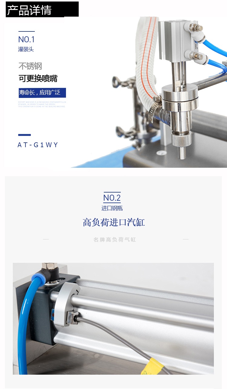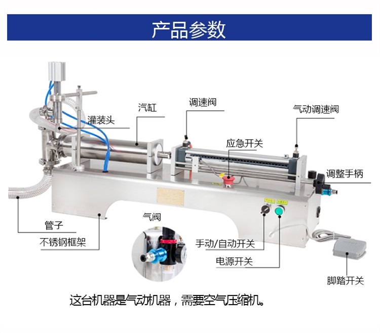 小型半(bàn)自動單頭液體(tǐ)灌裝機氣缸細節展示
